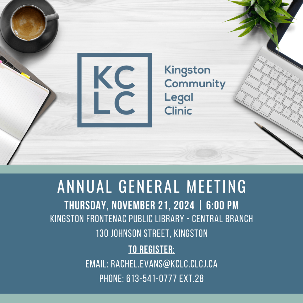 The Board & Staff of Kingston Community Legal Clinic invite you to our Annual General Meeting (AGM) on Thursday, November 21, 2024 at 6:00 p.m.
